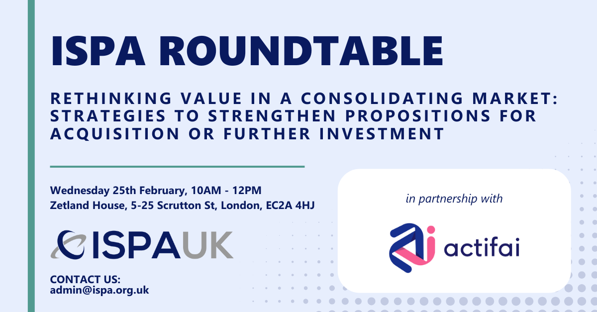 In this context, ISPA is partnering with Actifai to bring together senior executives to discuss the core metrics for sustainable returns and the commercial strategies required to meet the objective of maximising enterprise value in a consolidating market.